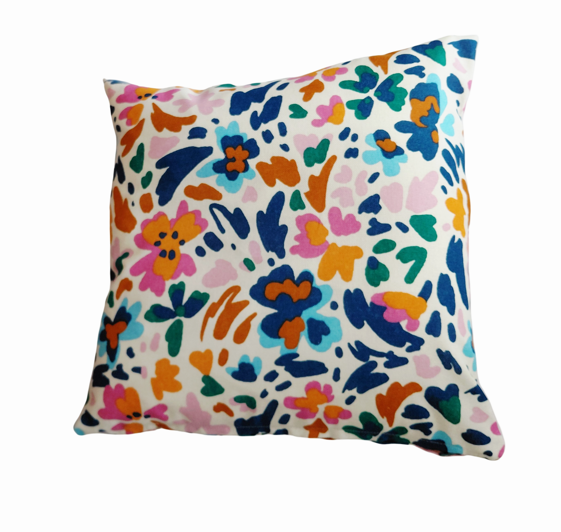 Composition: Abstract floral cushion in blue, orange and pink with black contrast back and concealed zip along the bottom. For double sided cushions select the 2 sided options from the 'cushion type' drop down menu. For custom design cushions please contact me for a quote.